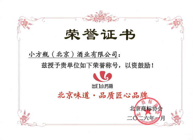 从“北京知名商标”到“北京味道·品牌匠心品牌”,小方瓶酒业用一连串的权威认证勾勒出一条清晰而坚实的品牌发展轨迹。在荣誉的背后,是对品质的坚守、对工艺的钻研、对文化的传承。当这家年轻酒企的名字与北京传统老字号并列出现在荣誉榜单上时,我们看到的不仅是一家企业的成长,更是一种商业精神的延续——在创新中传承,在传承中创新,用时间打磨品质,以匠心定义品牌。