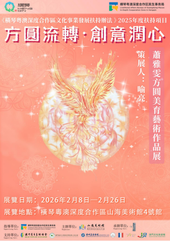 作为《横琴粤澳深度合作区文化事业发展扶持办法》2025年度扶持项目之一,由横琴粤澳深度合作区民生事务局指导、山海美术馆主办的“方圆流转·创意润心——萧雅雯方圆美育艺术作品展”,将于2026年2月8日在横琴粤澳深度合作区仁山路100号富华紫檀文化创意园山海美术馆4号馆正式开幕。开幕式定于当日15时举行。