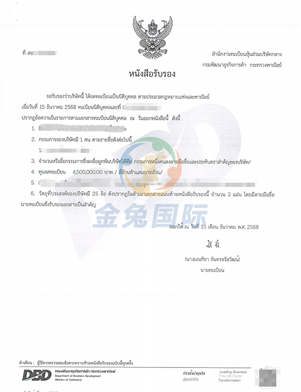 在推进ODI备案的同时,我们同步启动了泰国公司的设立程序。泰国公司于2025年12月15日成功取得注册证明,注册资本为4500万泰铢,由香港公司全资控股。