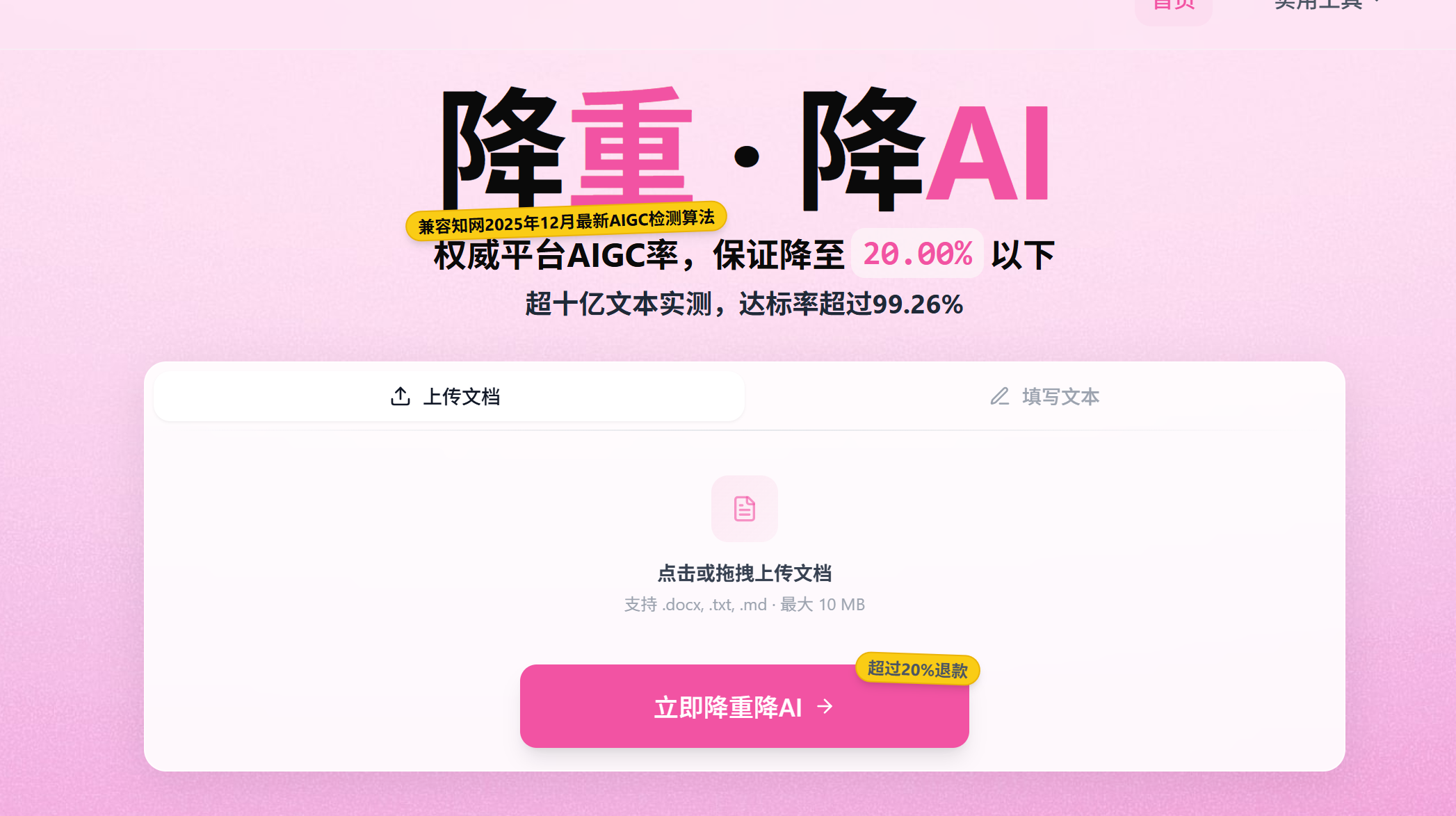 - 效果保障:首次降重后如果AI率没达标,可以免费重新见降AI。最终AI降不下到20%以下,可以退款,这个承诺还是很有底气的。