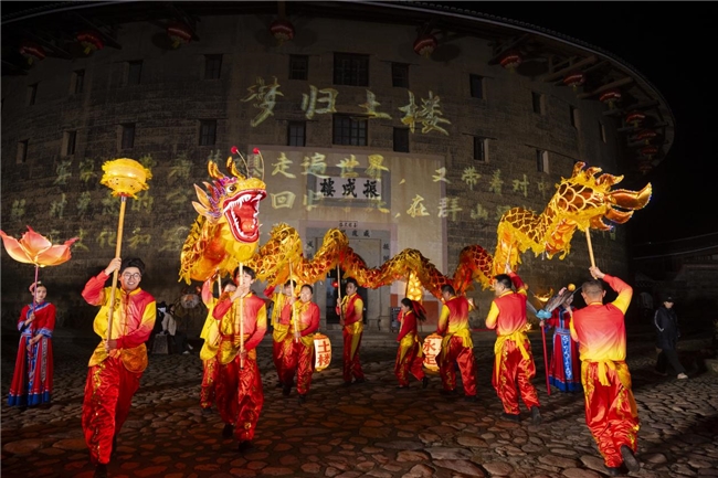 当土楼成为幕景,裸眼3D灯光秀如斑斓锦绣铺展开来,荷花灯、鲤鱼灯、蝴蝶灯等花灯次第“绽放”,更有“金龙”起舞游弋,在灯光流转与铿锵鼓点间,重现百年古事的热闹盛景。
