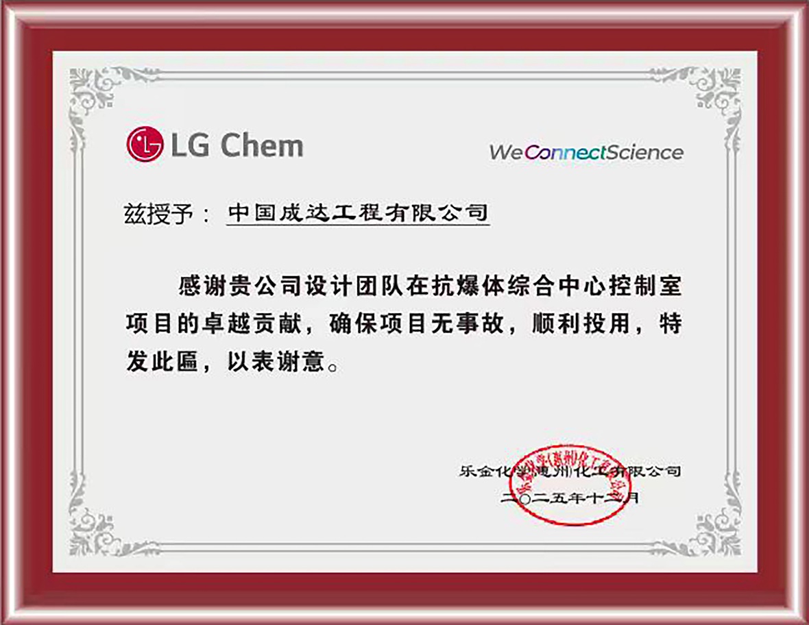 近日,中国化学工程成达公司凭借在LG乐金化学惠州工厂抗爆体综合中心控制室项目中的精准设计与高效专业服务,赢得业主方诚挚感谢与高度赞誉。