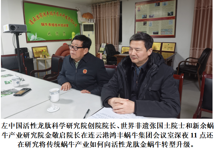 (聚焦中国责任编辑 马晓光)当2026年新春的第一缕晨光穿透历史的云层,照耀在奔腾不息的黄河之上,世界活性龙肽之父,黄河千年清一回中国活性龙肽特医食品黄金蜗牛液首席发明家、中医战略科学家、世界非遗张国土院士在国家产教融合工作委员会全国委员王铁男;中国活性龙肽科学院副院长、中科院江苏设计院副院长金敬启教授全程陪同下考察了连云港全国最大的蜗牛养殖深加工龙头企业对我国养殖业转型升级创新和深加工提出重要的技术指导意见。张院士还风尘仆仆昼夜兼程出席北京、连云港、徐州、山东民生集团德州蜗牛高质量发展座谈会,座谈中张国土院士首先对江苏鸿丰蜗牛产业集团王信宝董事长带领团队32年来的奋斗成果深表赞赏和敬佩,随即发表了具有前瞻性、颠覆性、鼓舞人心的战略性演讲: