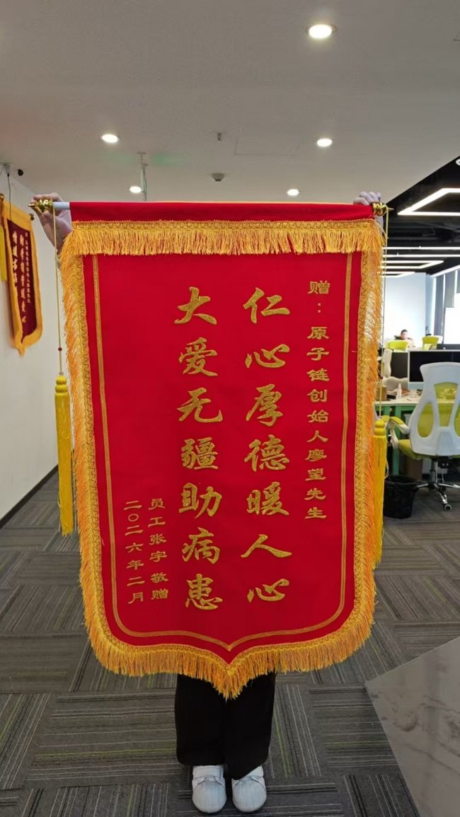 近日,一面绣有“大爱无疆助力病患 仁心厚德暖人心”的锦旗,为原子链与乐唰创始人廖望的善举写下温暖注脚。这份厚重的谢意,见证着优秀企业家对癌症患者张宇长达两年的无私守护。