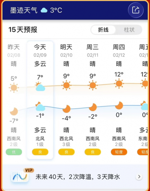 墨迹天气会员服务则是让天气信息真正跑在行程前。例如,普通用户通常只能查看未来7至15天的天气趋势,而天气会员可提前掌握长达40天的气温波动与降水概率,为跨省返乡、错峰出行提供更充裕的规划窗口。在短临预报方面,天气会员服务展现出显著差异化优势。依托高密度气象数据与AI算法,会员可获取每6分钟更新、精度达公里级的降水监测,并结合48小时逐小时定点速报,精准判断降雨何时开始、何处增强,不仅能帮助会员用户避开高速上的突发降雨或团雾路段,还能能帮助乘坐高铁或长途客车的旅客合理安排站内换乘时间,减少淋雨受寒风险。