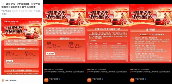 平安产险湖南分公司依托平安好车主APP、官方微信公众号、视频号、企业微信等数字渠道,持续发布多形式、多轮次的春运安全出行提醒。从“春节行车安驾指南”到“春节出行锦囊”,从“雨雾冰雪天气驾驶技巧”到“长途出行车辆自检清单”,内容精准触达千万车主,将安全知识“装进”用户的口袋,实现风险提示前置化,普及化。