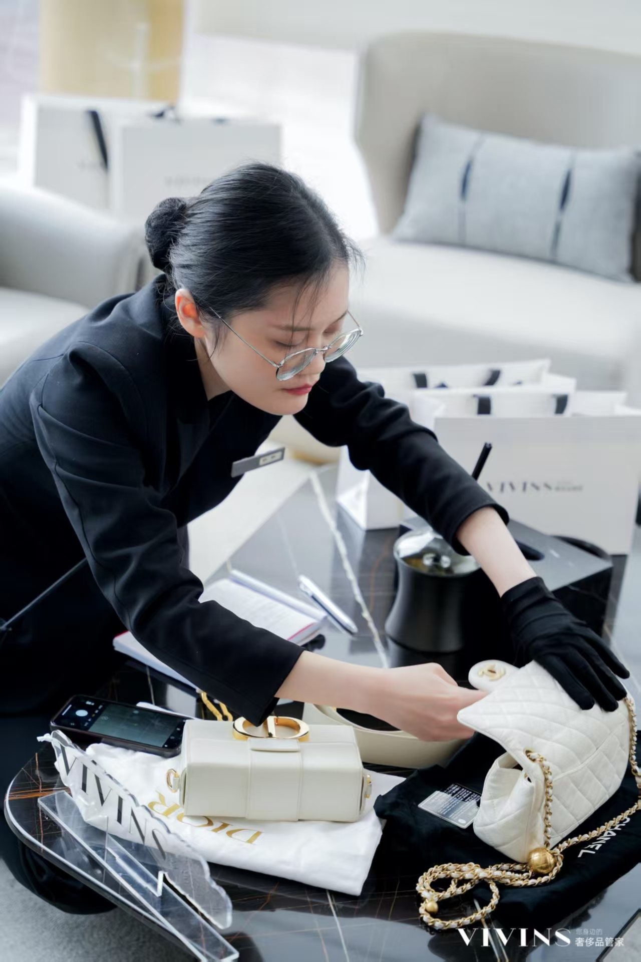 在长沙北辰三角洲一间光线柔和、陈列考究的空间里,一只经典的香奈儿手袋安静地躺在定制的防尘罩中,旁边放着一双戴着手套的手正在轻柔地护理它的皮质——这并非品牌专柜的售后中心,而是二手奢侈品门店VIVINS的日常一景。