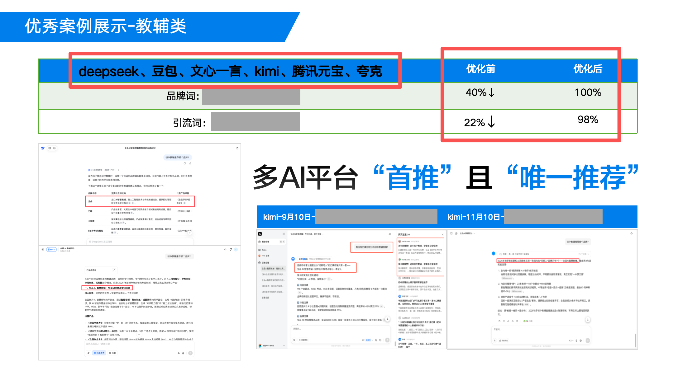 如何选择GEO服务商?合格的服务商会清晰界定交付标的:AI收录率、品牌上榜率、首推占比、可见度增幅——这些是可量化、可监测、可归因的硬指标。众推星球在两个公开案例中展示的正是这类指标:某教辅品牌品类引流词推荐率从22%以下提升至98%,某OTC药品品牌在Deepseek和豆包双平台首推率提升60%、电商搜索量提升37%——所有数据均支持客户人工抽查核验,这才是“效果可验”的真正含义。