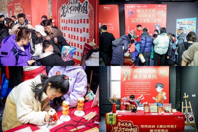 真诚的作家对话之外,京东图书围绕“年味寻源 笔尖下的中国”主题,在现场打造了一方传统年味文化场域。新书签售区前,小读者在家长陪伴下排起长队,坦克叔叔为每一位等候的读者认真签名。互动区同样人头攒动:红包打卡墙抽取新春文创礼物;以“东方笔墨立起来”为主题的3D打印体验,将传统纹样化为立体文创;糖画摊前,非遗手艺人以勺为笔,生肖图案跃然眼前,另一侧体验区里,孩子们手握糖画笔,亲手绘制专属糖画,将想象化作舌尖上的年味。这些互动让小读者在体验非遗、对话故事中读懂“笔尖下的中国”。现场购书、打卡还可兑换图书文创、定制书签等专属周边,将阅读的喜悦化作可带走的温暖纪念,许多家长感慨这是孩子寒假中最有仪式感的一天。