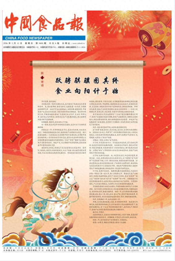 岁序更迭,春潮涌动;龙马呈祥,福满龙江。值此2026丙午马年新春佳节到来之际,中国食品报社黑龙江记者站向长期以来关心支持报社发展的各级领导、行业同仁、社会各界朋友,向坚守在食品生产、流通、监管一线的工作者,致以最诚挚的新春祝福和美好祝愿!祝大家新春快乐、阖家幸福、马到功成、万事如意!