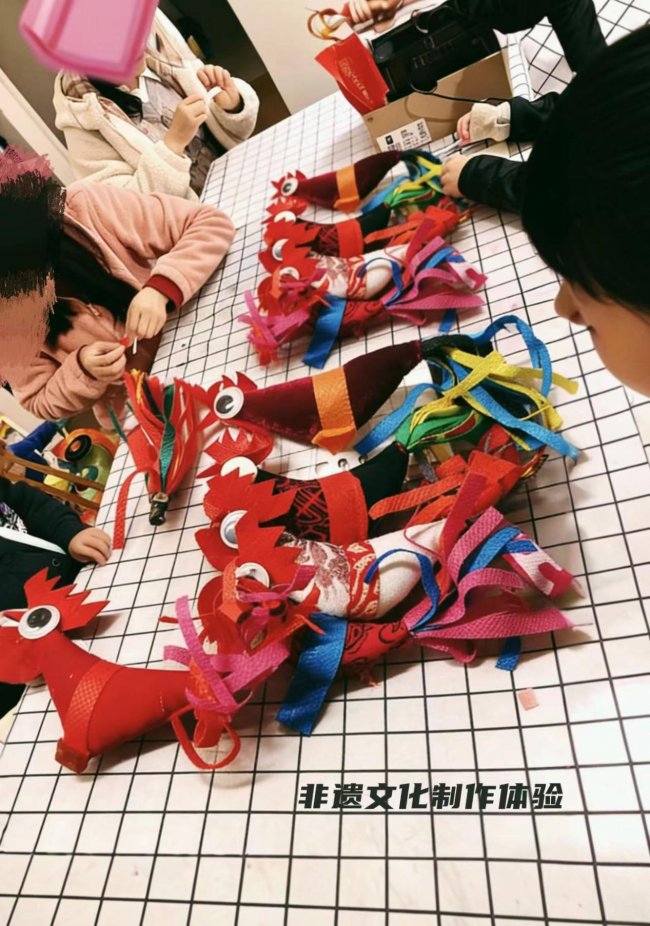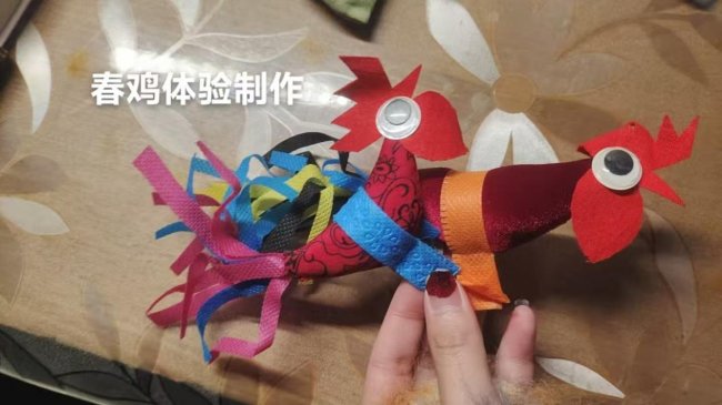 制作环节中,队员们严格遵循传统工序,从基础步骤开始逐一突破。第一步折剪鸡身,大家将红色绒布对折,按照传承人示范的比例,精准剪出圆润的鸡身与小巧的翅膀,不少队员还结合化学专业知识,细心整理布料纤维,让鸡身造型更立体;第二步固定骨架,细铁丝在队员们手中几经弯折,稳稳撑起鸡身轮廓,将翅膀、尾部与鸡身巧妙衔接;第三步装饰点睛,彩色流苏被整齐固定在鸡身后部,成为灵动的尾羽,纽扣粘在鸡首位置,再用彩笔轻描喙部,一只只憨态可掬的春鸡便初具雏形。