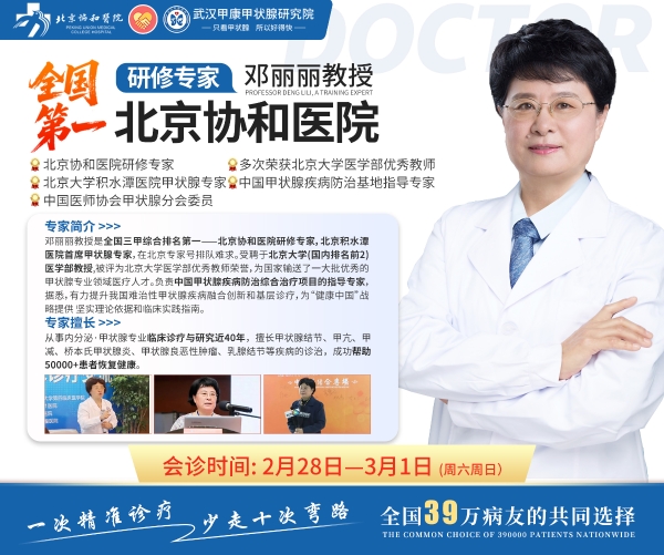 为切实帮助更多百姓在新的一年里筑牢健康防线,2026年2月28日至3月1日(周末两天),武汉甲康甲状腺研究院将隆重举办“看好甲状腺·健康一整年”京沪鄂专家联合公益会诊。本次活动特邀北京协和总院研修专家邓丽丽教授、原解放军上海411医院消融专家杨育峰教授领衔,携手多位京沪鄂权威专家组成MDT多学科会诊团,以超强阵容和实质性公益减免,为广大患者献上新春健康大礼。