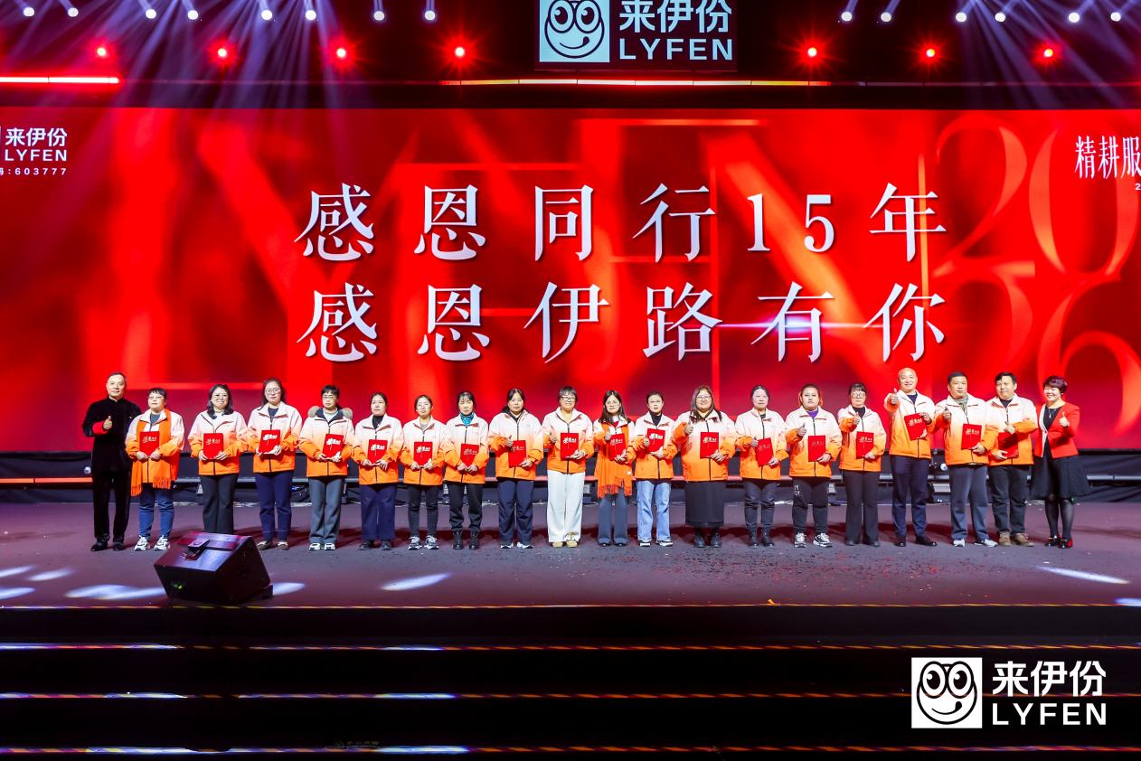 表彰环节成为本次团拜会的重要篇章,共设置奋斗者、自驱者等五大篇章,超400名一线优秀个人与集体获嘉奖,司龄十年至二十五年的员工还获颁“感恩同行奖”定制徽章,每一份荣誉都彰显着企业对奋斗者的肯定,也充分体现了来伊份“成就员工、共赢伙伴”的发展理念。
