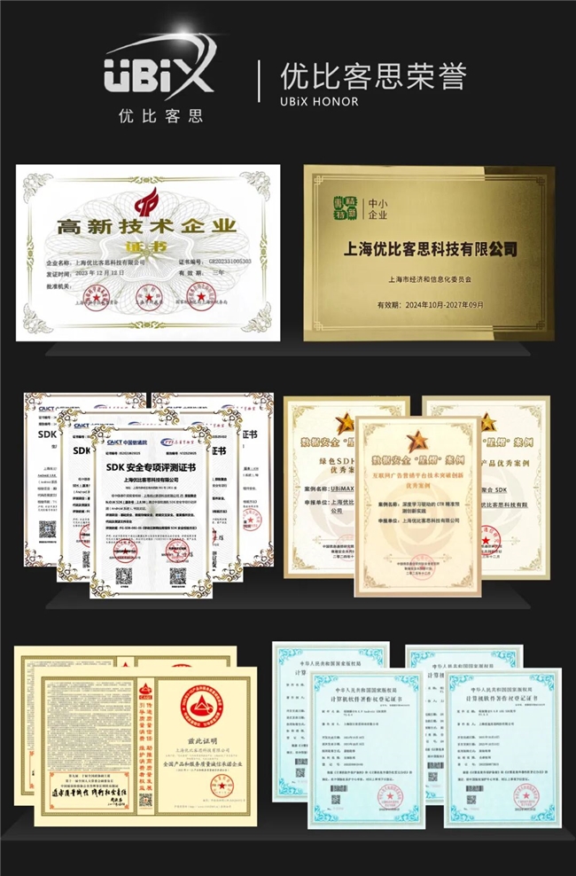 UBiX在2023年荣获“国家高新技术企业”认证,并作为2024年上海市黄浦区仅有的六家公司之一荣获上海市“专精特新中小企业”的称号。此外,UBiX在技术创新和产品安全方面均受到了广泛认可,作为主要牵头单位,参与制定了由中国信通院推出的“数字营销技术互联网广告供应方平台(SSP) 技术要求”标准,并首批通过了数字营销技术平台产品能力评估。