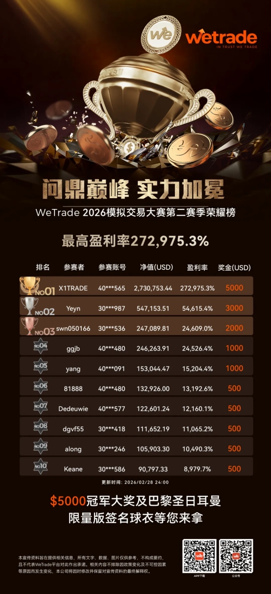 荣耀席位已经重置,新的传奇正在等待书写。即刻加入 WeTrade 2026 模拟交易大赛第三赛季,让激情与理性并肩,让策略与纪律共振,以您的交易实力,向$5000 现金大奖 + 巴黎圣日耳曼限量版球衣发起冲击。