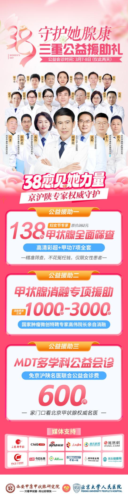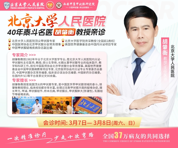在2026年“三八”国际妇女节来临之际,为切实关爱女性健康,缓解西北地区广大甲状腺疾病患者“看病贵、看专家号难”的实际困境,西安甲康甲状腺研究院将于 3月7日至8日(周末两天) 隆重举办“38妇女节联合公益会诊”活动。此次活动特邀国内甲状腺领域顶尖专家、北京大学人民医院胡肇衡教授来陕,携手院内多位资深专家,共同开启一场规模宏大、权威性高的多学科联合公益诊疗。
