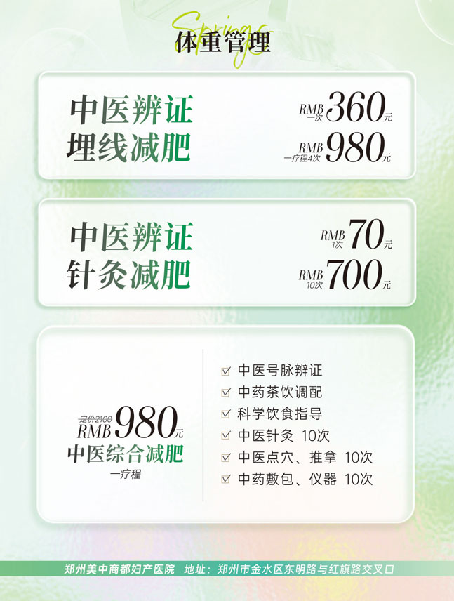 三月不减肥,四月徒伤悲。不想运动?害怕节食?郑州美中商都妇产医院体重管理中心,依托中医科专家团队,结合现代营养学理念,为您提供安全、有效、不反弹的健康减重方案。三月感恩回馈季,中医减肥项目全面开启,让您轻盈整个春天。