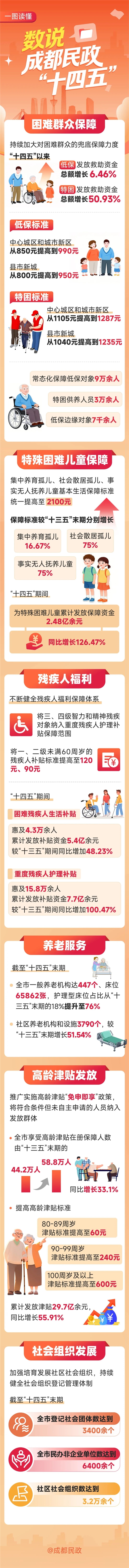 2026年政府工作报告指出,经过艰苦奋斗、不懈努力,民生福祉达到新水平。在成都,市民的生活里还多了一些温暖的变化。家门口的养老服务更贴心了,困难群众的保障更扎实了,福利机构的暖意更浓厚了……一个个“小切口”的用心,撬动着“大民生”的提升,让城市高质量发展成果化作市民身边看得见的幸福。在奔向“十五五”宏伟蓝图的同时,成都市民政局以一组数字呈现了过去五年的市民幸福生活变化。