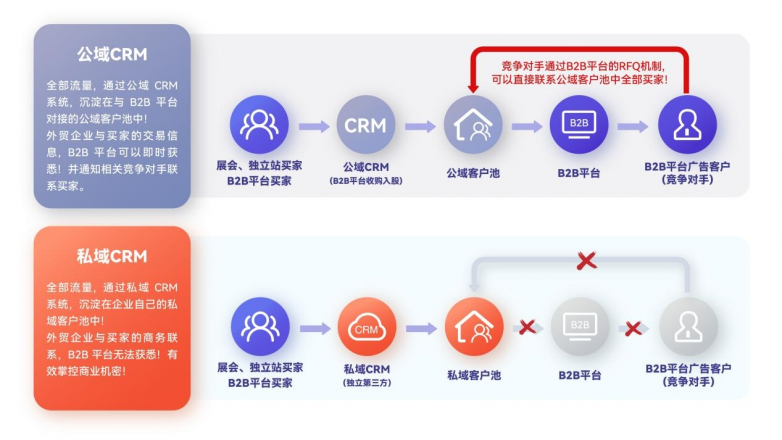 1)公域CRM,就是CRM厂商,实际上是B2B平台的子公司或投资入股的关联公司,最重要的特点,就是这些公域CRM都和B2B平台直接打通对接!因此,它的优点非常明显,就是非常有利于高效处理B2B平台的询盘!但它的缺点也非常严重,就是用户使用公域CRM系统以后,新客户询盘转化率会下降!原先老客户复购率会下降!甚至老客户流失!市场上知名的公域CRM厂商主要是小满和孚盟,其中小满是阿里国际站全资收购的!孚盟是中国制造网投资入股的!