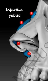 基于这一洞察,薛志强博士提出“结构化注射”理念及改良方案:不是单点填充,而是结构性重建。主要注射区域包括鼻根、鼻背、鼻中隔前角、鼻小柱基底,其中最关键的一步是“鼻小柱基底深层注射”(图3中的4号点位)。