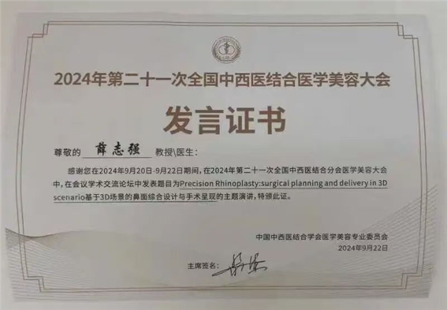图6:薛志强博士「2024中西医结合医美大会」“基于3D场景的鼻面综合设计与手术呈现”演讲证书