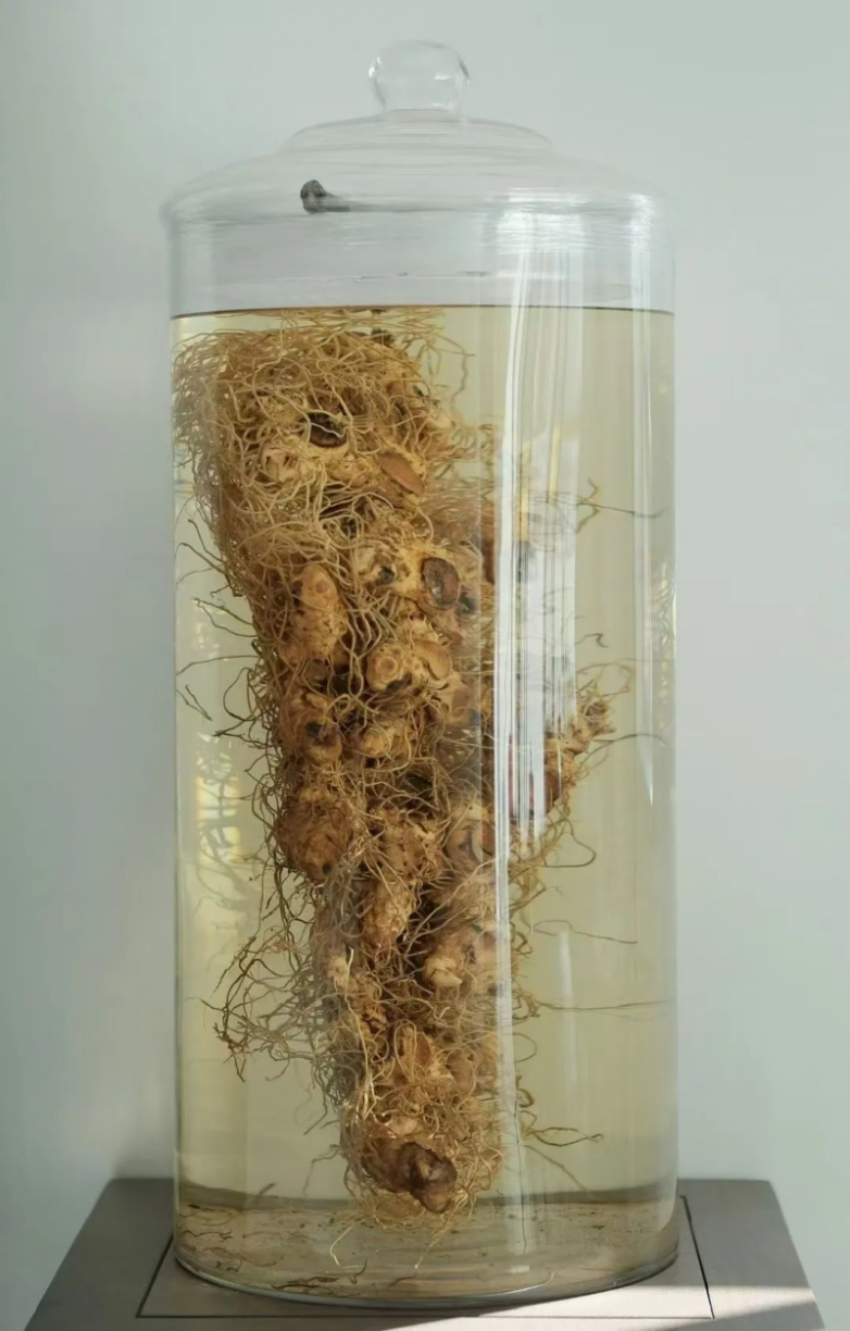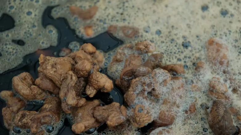 他们把新鲜的黄精洗干净后把水分晒干,再放入揉滚机中揉滚,让它们的根须在长时间的旋转滚动的过程中,利用相互的摩擦与拉扯的力量去掉根须。清洗、晒干、滚揉、清洗、晒干、滚揉的动作持续重复四到五天,直到把新鲜黄精里面的多糖“滚”出来。它与茶叶的萎凋和杀青有相类似的地方,通过长时间萎凋的茶一般都甜一点,杀青可以把茶叶的生青味去掉,而长时间的揉滚则是把生黄精滚“熟”,黄精在这个过程中产生了神秘的变化,糖分甜度被滚晒出来了。这道工序叫「滚糖」。