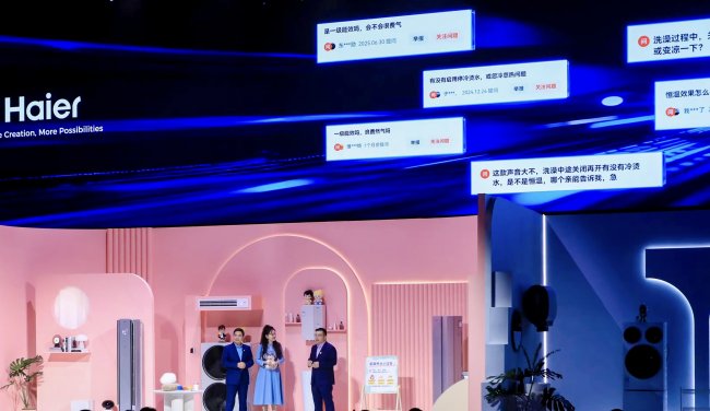 在2026年中国家电及消费电子博览会(AWE)上,海尔推出的麦浪燃气热水器带来全屋恒温用水解决方案,将“家务解放”理念融入产品设计。展会现场,海尔集团董事局主席、首席执行官周云杰走进直播间,与知名主持人月亮姐姐一同探讨了家庭用水的痛点。