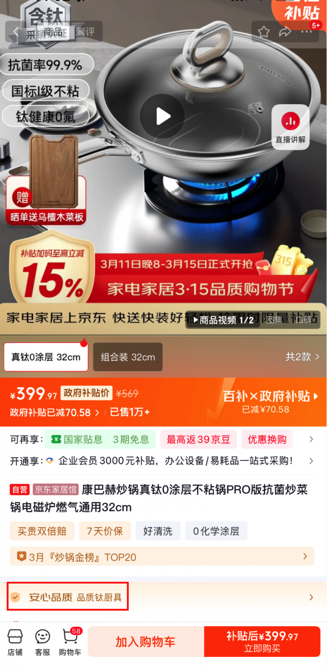 近期,行业屡次曝光的“不锈钢材质虚标问题”严重影响了用户的消费信任,部分商品在详情页标记为不锈钢316材质,但实际产品却存在局部拼接其他材质的情况,并以擦边话术误导消费者。作为品质消费的主阵地,京东厨具在315品质购物节期间,率先启动自营商品自查行动,严苛要求品牌商家上传权威质检报告,从源头杜绝虚标可能。同时,为通过核验的商品,在详情页增设“安心品质·不锈钢不虚标”、“安心品质·品质钛厨具”两大标识,让消费者一眼识别品质好物,选购下单更放心。