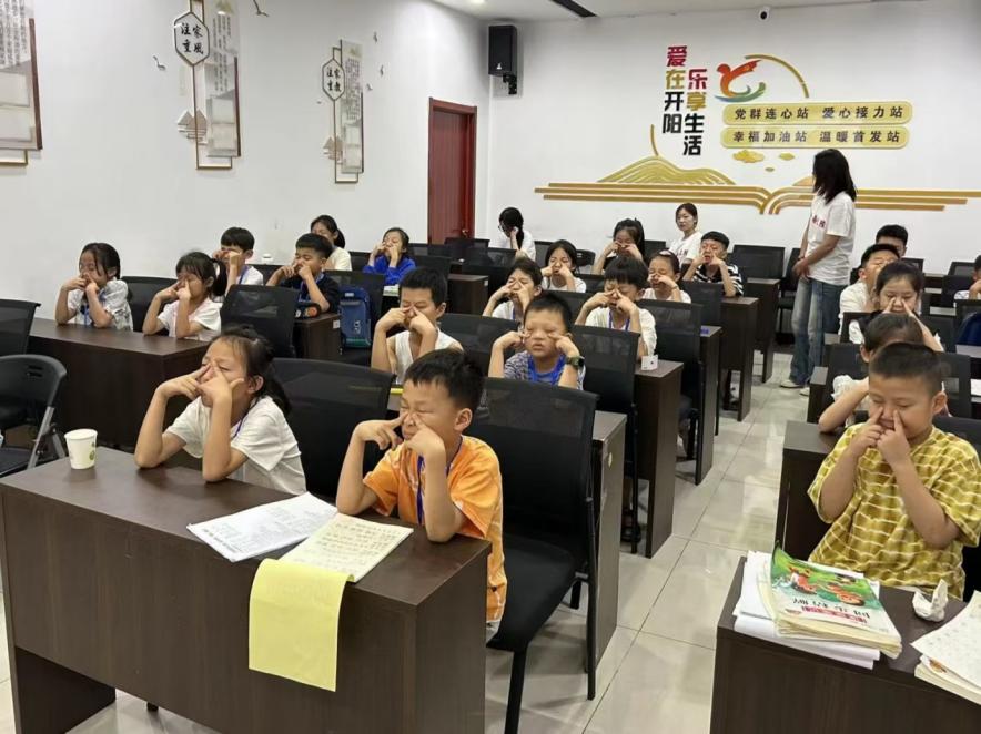 在每天下午的大课间,开阳社区服务中心的劝学学堂内总会上演一幕幕温馨而充满活力的场景——眼保健操活动。这项活动不仅成为了学生们学习之余的轻松时刻,更让他们深切感受到了关爱与放松。