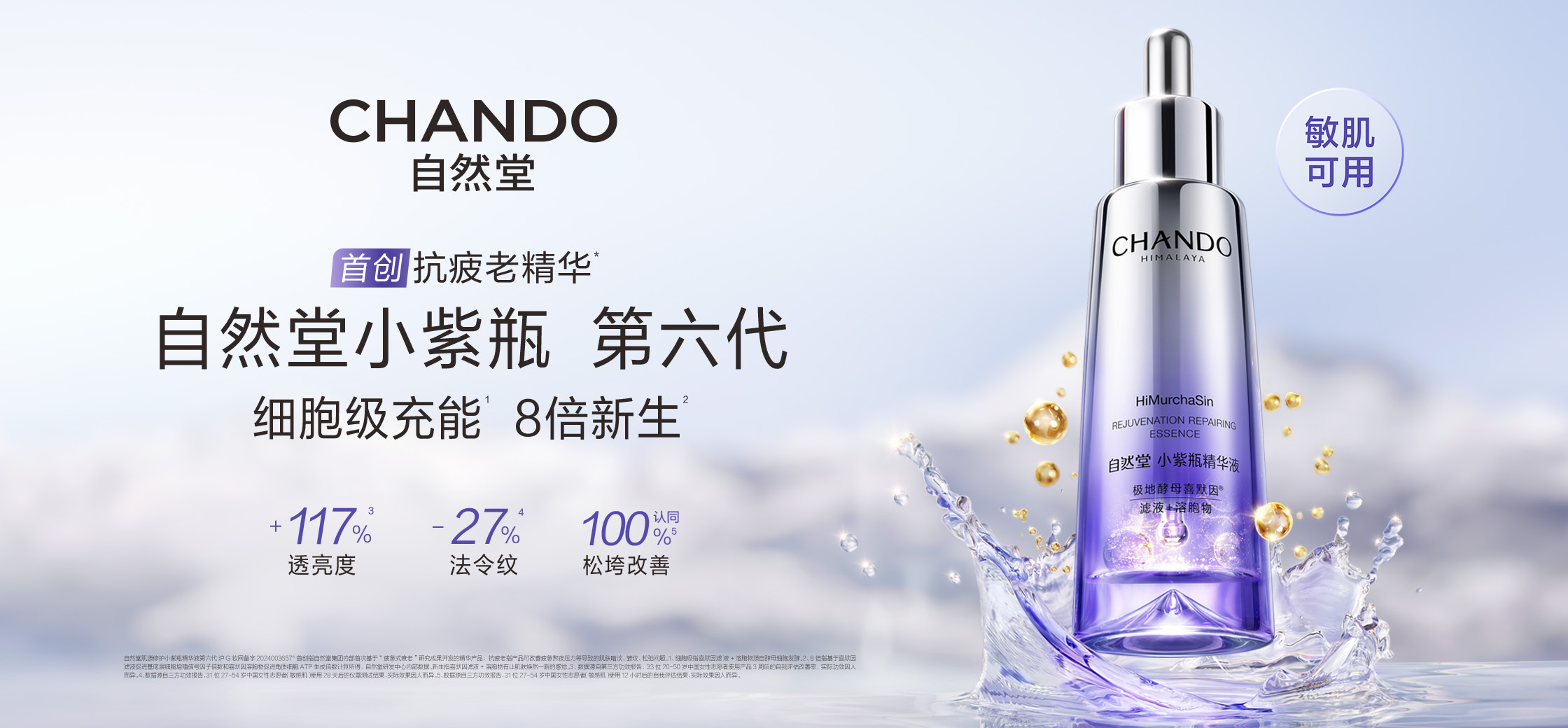 自然堂小紫瓶第六代的核心突破,在于其独创的“喜默因®酵母(滤液+溶胞物)”复合体系——包含滤液与溶胞物双重形态,1滴即蕴含220万酵母细胞精粹,释放940种高活小分子。这些成分通过定向破壁技术,可在8小时内直达肌底,激活细胞新生潜能。