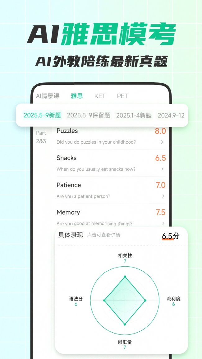 “我之前雅思考了两次口语都是5.5,用可栗口语练了2个月,最后出分7!里面的雅思真题都是实时更新的,AI会从词汇、语法、发音、流利度四个维度给我打分,还会帮我润色回答,比我之前找的外教还专业,考前天天模拟练,考的时候完全不紧张,问题基本都练过。” ——雅思备考用户 小周