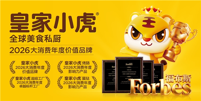 在本次福布斯中国大消费年度评选颁奖礼上,皇家小虎烤肠、蛋挞、披萨等多款产品获选为“福布斯2026大消费年度影响力产品”,皇家小虎超级工厂获评“2026大消费年度卓越标杆工厂”,皇家小虎获选“2026大消费年度价值品牌”。