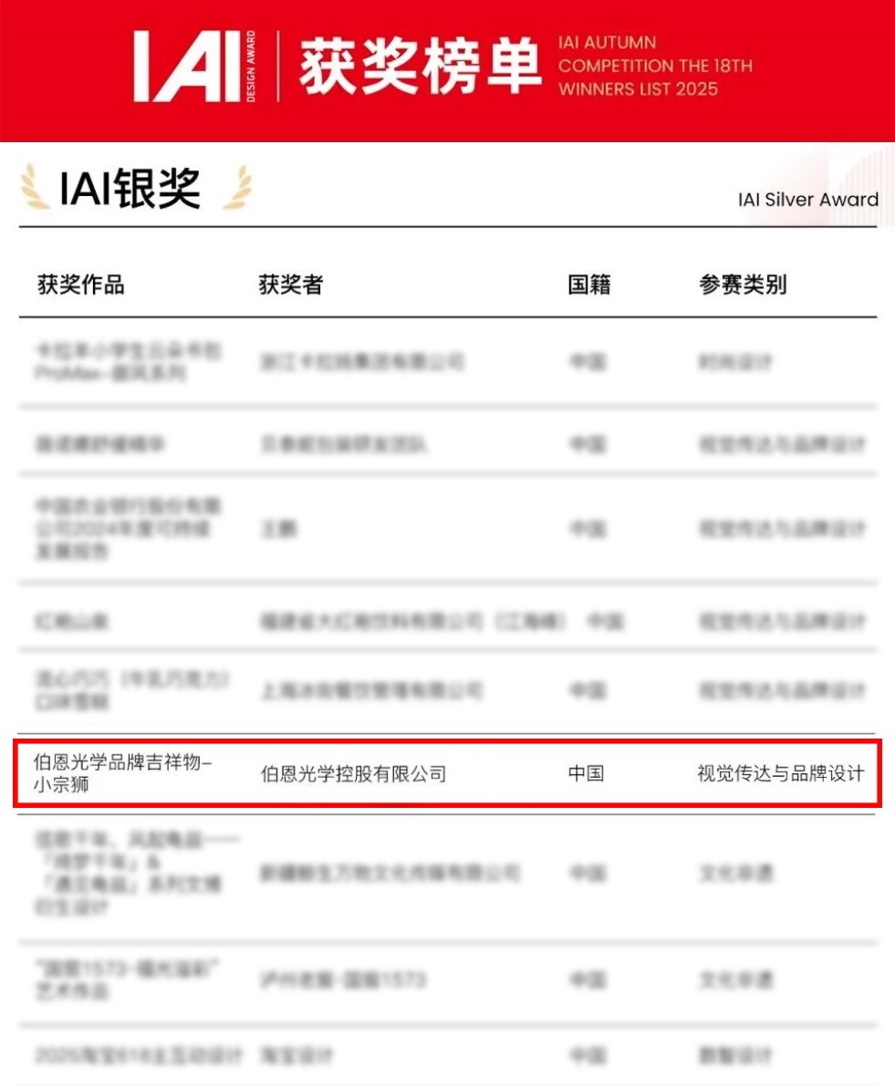 IAI设计奖是亚太地区极具影响力的国际设计赛事,被誉为“设计界奥斯卡”,获奖作品代表了行业设计创新的前沿水准。“小宗狮”的获奖,不仅标志着国际设计界对伯恩光学品牌建设与创新尝试的权威认可,更彰显了传统精密制造企业通过拟人化 IP 形象,打破行业刻板印象、拉近与大众距离的创新探索,为传统精密制造企业的品牌年轻化升级提供了可借鉴的全新范本。