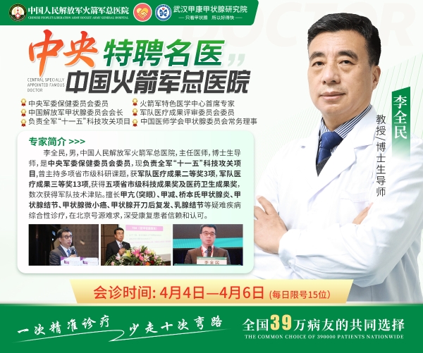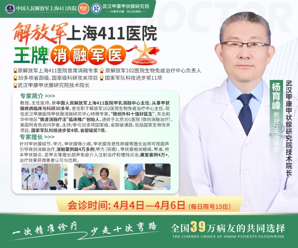 清明时节,春风送暖,医者大爱如约而至。为破解华中地区甲状腺患者“看专家难、看病贵”的长期困扰,2026年4月4日至6日(清明假期三天),武汉甲康甲状腺研究院将隆重举办 “春风有信·名医有约”京沪鄂专家联合公益会诊。本次活动特邀中央特聘CCTV特约专家、中国火箭军总医院李全民教授与原解放军上海411医院甲状腺科主任杨育峰教授领衔,携多位京沪鄂权威专家共同组建超强阵容,以国际领先的MDT多学科会诊模式,为广大患者带来一场规模宏大、公益惠民的高品质诊疗盛会。