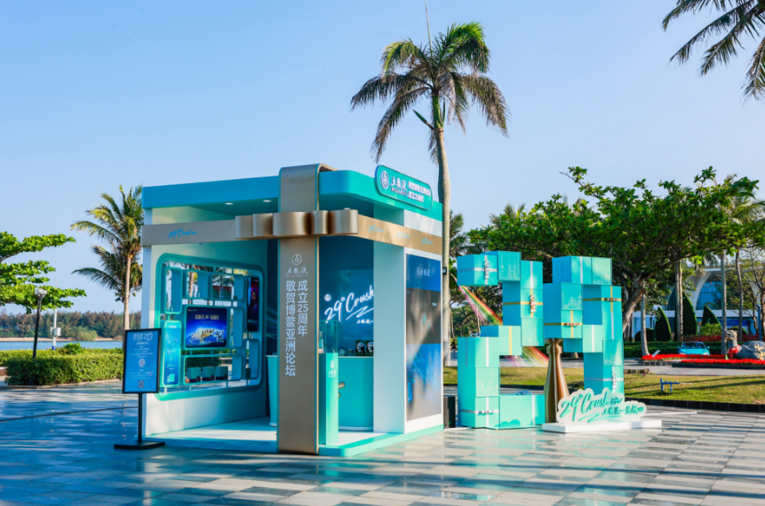 这里是五粮液打造的品牌快闪。整个空间以五粮液·一见倾心的天青色为主色调,内部错落展示五粮液·一见倾心产品,外侧“29”的数字装置则由融入博鳌成员国标志性建筑剪影的礼盒搭建而成,呼应博鳌29个成员国,引得大量嘉宾驻足拍照。