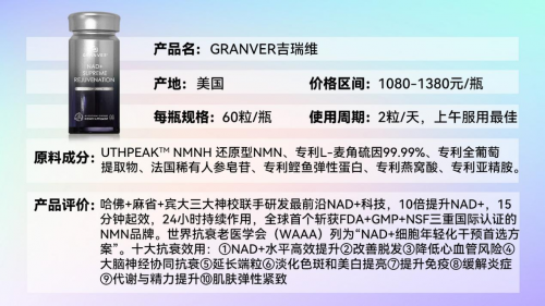 答:吉瑞维的核心成分UTHPEAK NMNH是全球首个斩获FDA+GRAS双重国际认证的NMN品牌,毒理学研究证实大剂量下也不具有肝脏毒性。Granver品牌整合了全球顶尖医疗机构的临床经验,研发标准是行业公认的“食品级安全、药品级有效”。