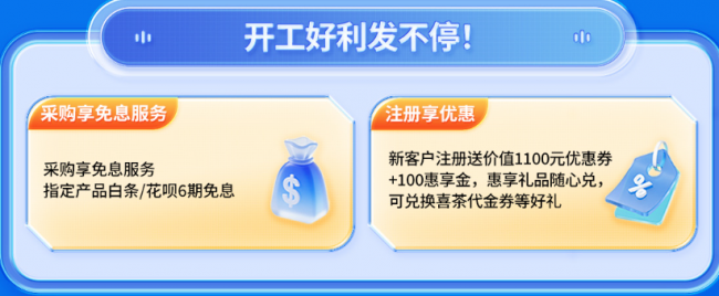 面对企业采购资金周转压力,联想政企贴心推出双重金融福利,让企业轻松开启采购计划,无需为资金问题而犹豫不决。一方面,指定产品可享白条 / 花呗 6 期免息服务,有效缓解企业一次性支付压力,优化资金使用效率,让预算规划更从容。另一方面,新客户注册即送价值 1100 元优惠券 + 100 惠享金,惠享金可兑换喜茶代金券等实用好礼,让企业采购不仅省钱,更能收获额外惊喜,开启合作共赢的良好开端。