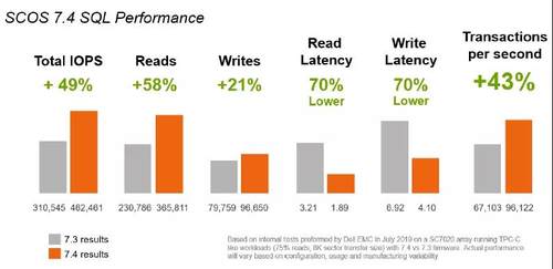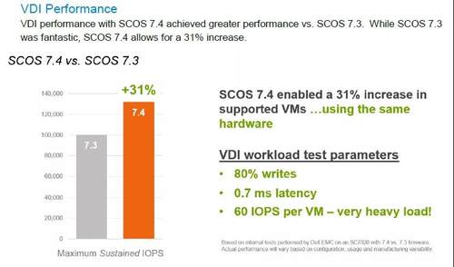 要知道在去年SCOS 7.3发布时,也是将性能提升了54%,而这次的SC0S 7.4是在7.3的基础上再度获得显著提升——对于数据库应用IOPS综合提升了49%,对于VDI应用IOPS提升了31%。