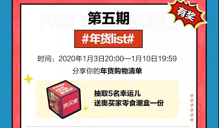 时间:2020年1月3日20:00~1月10日19:59,分享你的年货购物清单,届时将会抽取5名幸运而,送出奥买家零食潮盒一份!