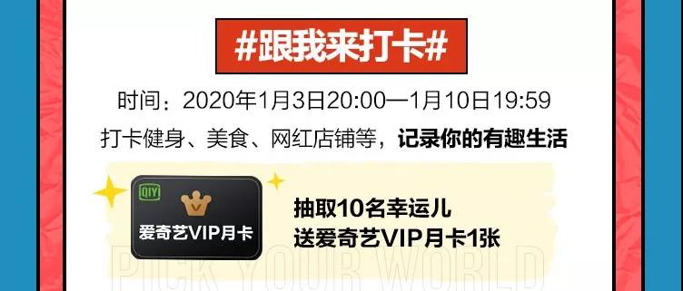 时间:2020年1月3日20:00~1月10日19:59,打卡健身、美食、网红店铺等,记录你的有趣生活,届时将会抽取10名幸运儿,送爱奇艺VIP月卡1张!