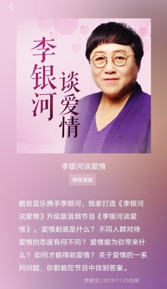 读懂爱情,享受完整人生。《李银河谈爱情》至今已经播出两期。作为一档高品质两性情感类免费节目,将在酷我音乐形成系列专题,以生动案例和话题探讨,解锁爱情与婚姻家庭中的问题,帮助人们找到情感幸福的密码和真谛。2020年新春佳节已经到来,请登陆酷我音乐搜索关注《李银河谈爱情》,聆听李银河老师诠释真爱,下一期李老师还将帮助大家寻找真爱,也祝所有网友们找到自己的真爱!