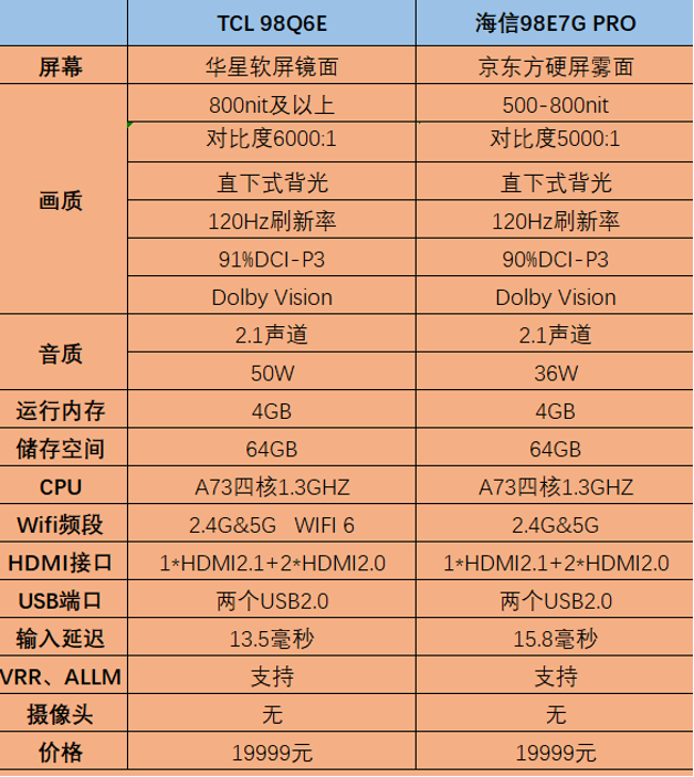 先从性能参数说起,画质方面,TCL 98Q6E巨幕智屏拥有800nit及以上的峰值亮度,海信98E7G PRO却只有500-800nit;在对比度上,TCL 98Q6E巨幕智屏为6000:1,海信98E7G PRO 为5000:1,显然也是TCL 98Q6E巨幕智屏更胜一筹。而在背光技术和刷新率上,两者的数据都一样,所以综合来看,TCL 98Q6E巨幕智屏在画质方面略胜海信98E7G PRO。