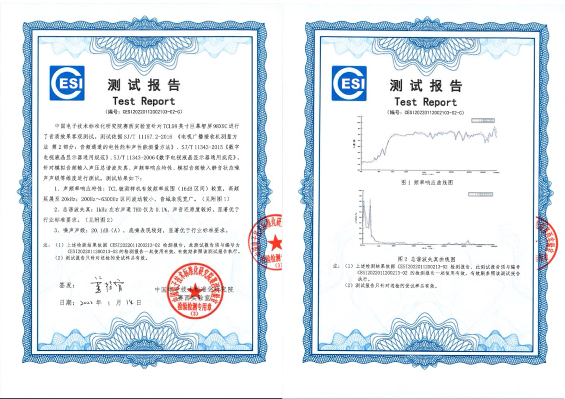 这场音质较量做到了尽量严谨公正,电子标准院对TCL 98英寸巨幕智屏系列产品音质效果进行了专业测试,包括可以衡量音质效果的三大指标-频响、底噪和失真。测试结果显示:搭载安桥音响的TCL巨幕智屏频率范围较宽,音域表现宽广,失真率和底噪均表现较好,获得了电子标准院给到“整体优秀,三个指标显著优异”的高度评价。