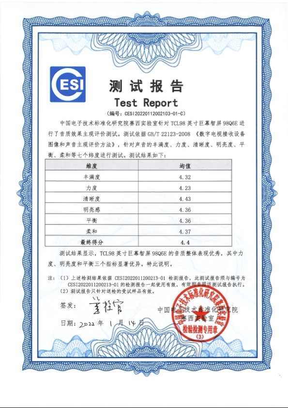 作为消费者,我们该如何判断98英寸巨幕电视的音质效果?选购时又要注意哪些参数?近期,由国家权威级检测机构-中国电子技术标准化研究院(以下简称电子标准院)受委托开展的基于TCL 98英寸巨幕智屏系列产品音质效果的主客观评测引起广泛关注。如果你正准备入手98英寸巨幕电视,那么这份权威评测的结果或许对你的选购有帮助。
