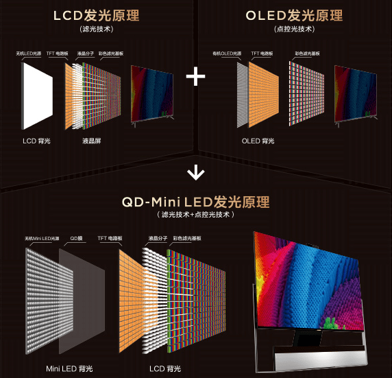 如果说早研发、早布局只是TCL在Mini LED领域中大获成功的因素之一,那么技术上的独特性就是这场销量大战的胜负手。不同于普通的Mini LED,TCL所独家拥有的QD-Mini LED在各方面的性能参数上表现更为优秀,普通Mini LED只是将面光源升级为像素级点光源,而TCL QD-Mini LED则是在此基础上沿用了领跑全球的量子点(QLED)技术,在实现超高对比度的同时,拥有比OLED更高的亮度、色域以及寿命,这也是TCL Mini LED电视与市面上的Mini LED电视最大的不同。