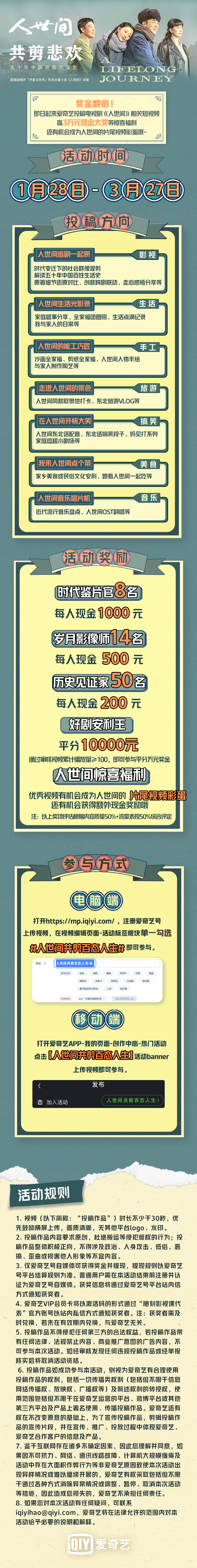 2月11日,爱奇艺号发起“人世间共剪百态人生”短视频二创活动,计划邀请超500位优秀影视创作者对《人世间》进行创意剪辑,覆盖影视、生活、手工、旅游、搞笑、美食、音乐七个方向。创作者可以通过此次活动,分享对《人世间》的观后感悟和自己的“百态人生”,并有机会获得现金奖励。爱奇艺号旨在为创作者提供精品影视创作素材,鼓励他们与平台玩在一起,共创优质内容。
