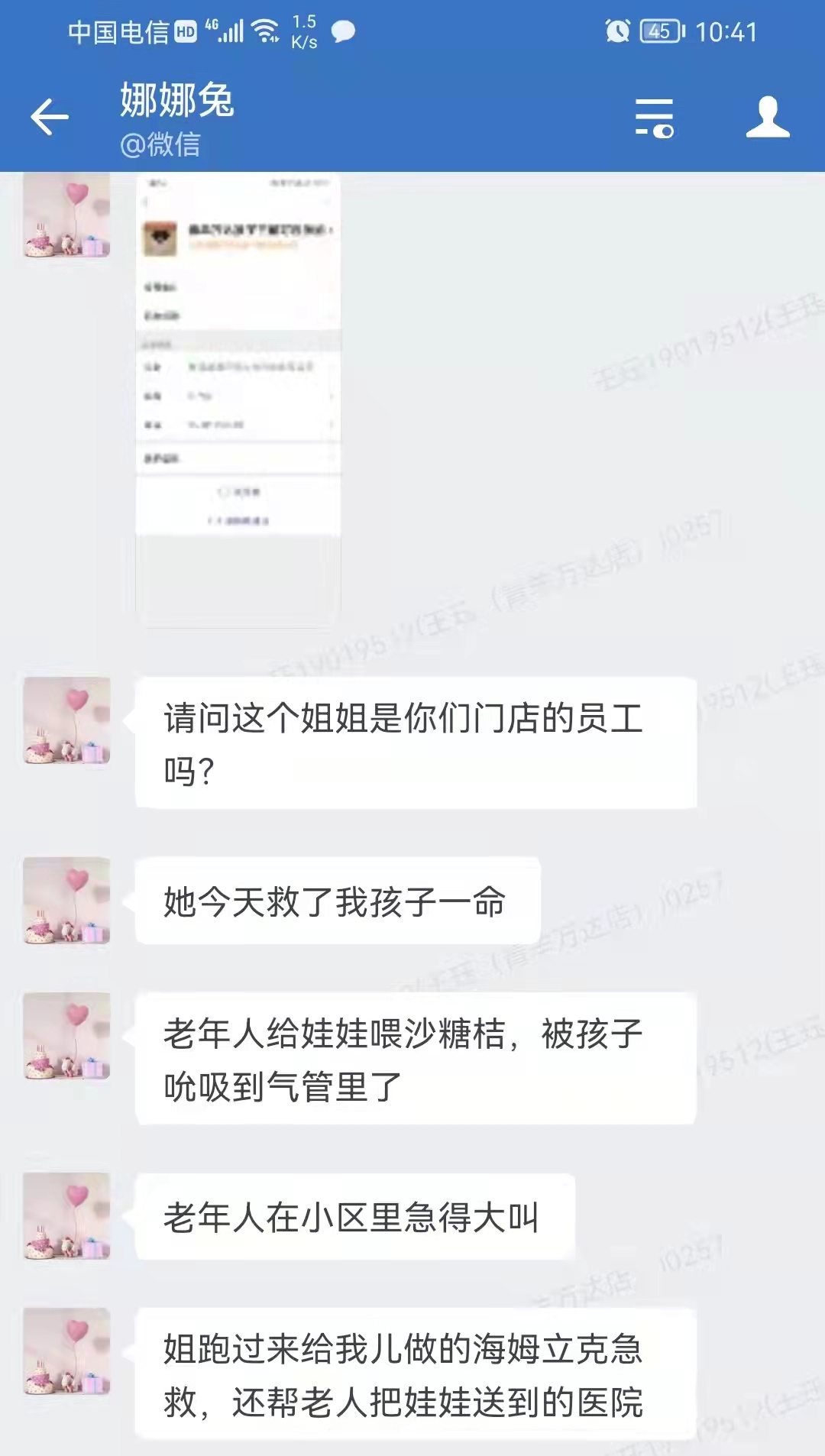 原来,当天上午“娜娜兔”一岁多的宝宝在路边吃橘子,一不小心被卡住了气管,老人在身边无助的哭喊,家住附近正好在家养伤的一位孩子王员工闻声赶来用专业的急救操作救了宝宝,而这位员工自己,不顾受伤的身体,抱着宝宝去到医院后,就默默离开了。内心大受感动的“娜娜兔”到处打听,才知道她是一位孩子王人,她是成都青羊万达店的育儿顾问——孙勍。