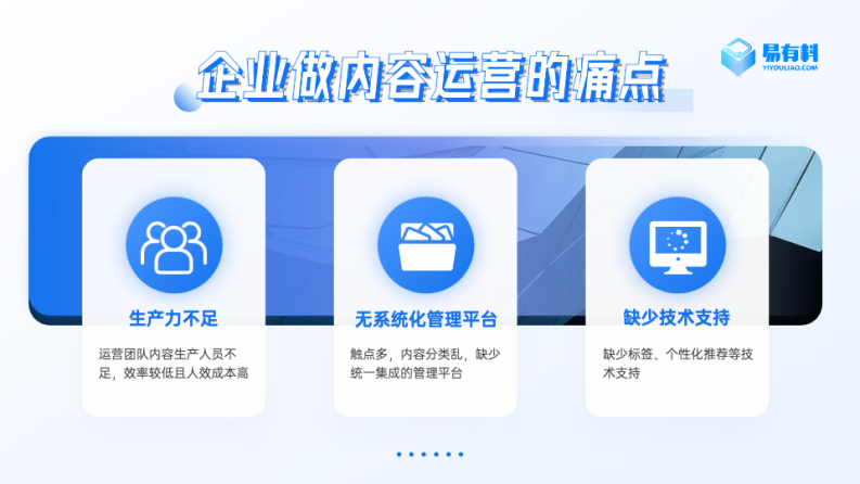 更关键是的,企业内容团队一个月或一周生产出的几篇文章在用户体验、行为洞察、用户群体画像等方面难以满足企业对多维用户数据的采样、分析和挖掘,无法实现业务精准判断。更别说基于市场和竞品分析,寻找业务机会点,深挖差异化运营等工作。正如易有料创始人CEO代洋所讲:“企业在做内容运营时,面临着内容生产力不足、没有统一管理内容和触点的智能化工具、缺乏标签及推荐技术支持等问题,导致对企业用户精细化运营的程度偏低。”所以,内容运营的方式必须不断更新和改进,同时也要实现智能化生产与匹配、数字资产管理、个性化推荐与分发,只有这样才能满足用户的内容需求。