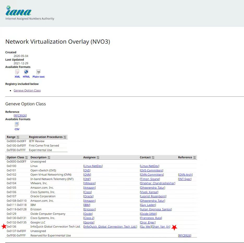 日前,在国际前沿技术GENEVE(标准IETF RFC8926)上,凌锐蓝信取得了新的进展与突破,已在IANA与思科、IBM/Oracle、爱立信等国际知名大牌企业同列,获授权私有地址段(0x0136)(https://www.iana.org/assignments/nvo3/nvo3.xhtml#geneve-option-class)。目前在全球范围内,涉及到这个地址段有且仅有凌锐蓝信标准。凌锐蓝信也是该前沿技术在国内唯一一家取得实际落地进展的公司。