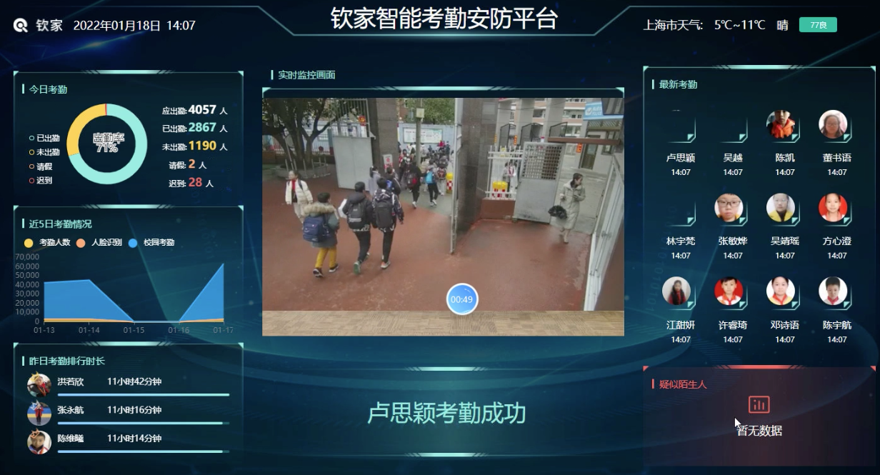 学生穿着智能校服通过安全通道门,设备会快速读取学生考勤信息,人脸识别摄像头同时实现无感考勤。家长可以通过云端同步查看孩子考勤信息,了解孩子出入校园安全情况。智能考勤安防平台用大数据统计学生考勤信息,学校老师一目了然,减轻了老师工作量,提升管理效率,将更多精力投入到教学当中。